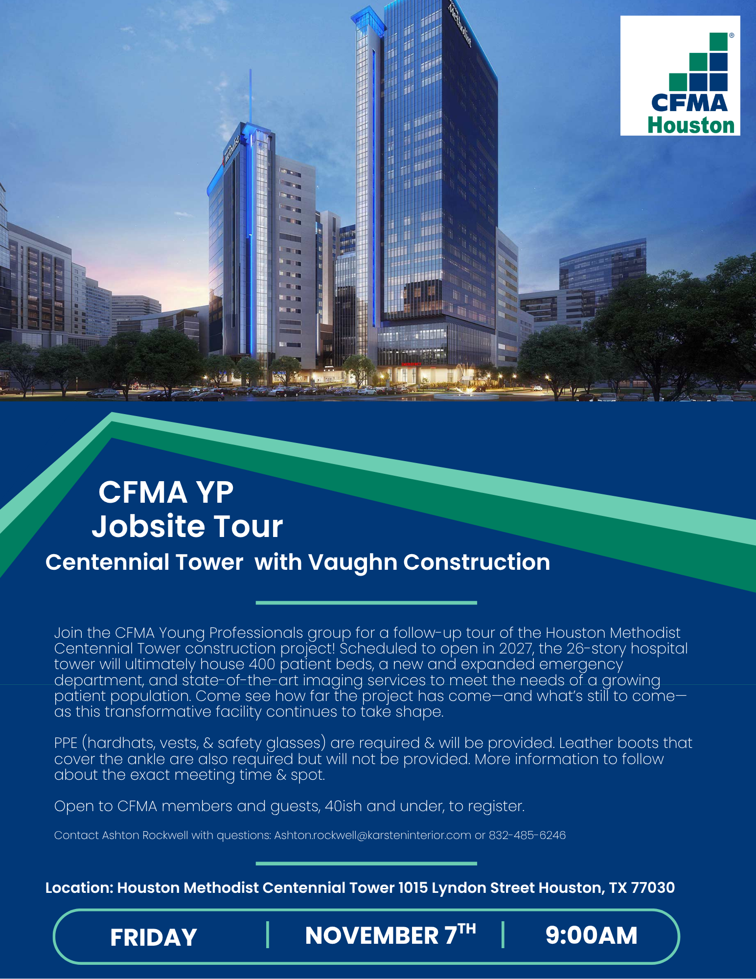 Join the CFMA Young Professionals group for a follow-up tour of the Houston Methodist Centennial Tower construction project! Scheduled to open in 2027, the 26-story hospital tower will ultimately house 400 patient beds, a new and expanded emergency department, and state-of-the-art imaging services to meet the needs of a growing patient population. Come see how far the project has come—and what’s still to come—as this transformative facility continues to take shape.