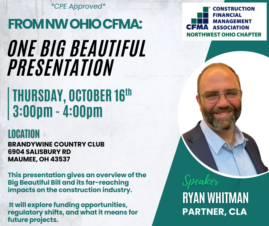 Ryan Whitman is a principal in the CLA office in Western Ohio. Ryan advises many clients with a focus on construction, real estate, and high net worth individuals including estate, gift & trust taxation.  Ryan is a current member and Past President of the Northwest Ohio Chapter of CFMA.